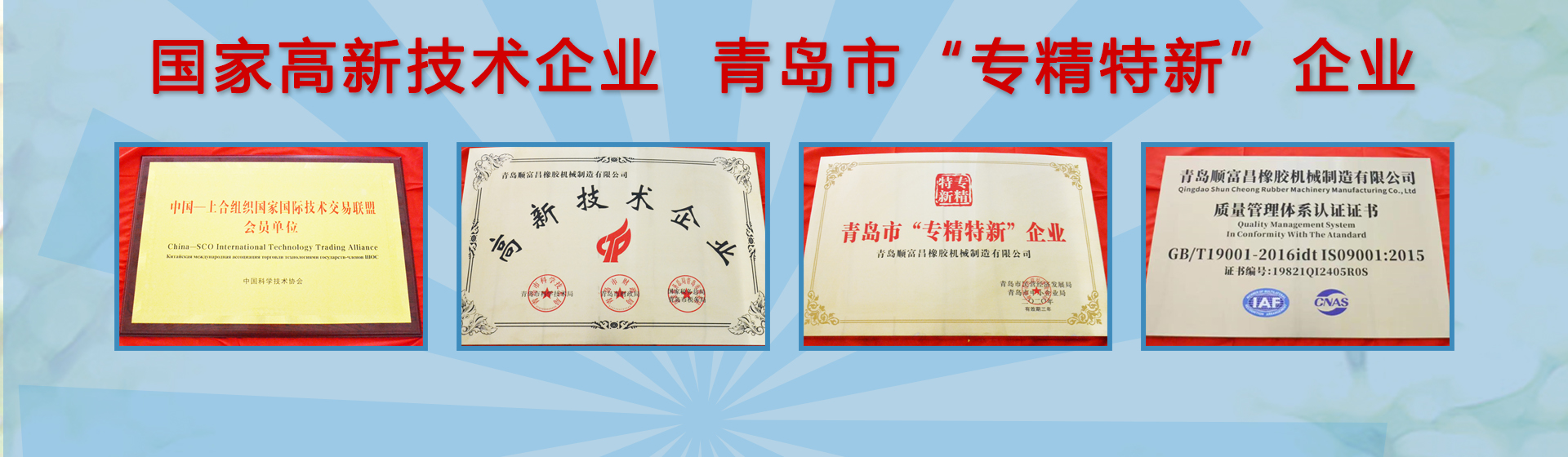 青島順富昌橡膠機(jī)械制造有限公司位于青島西海岸海洋高新區(qū),是國(guó)內(nèi)一家專業(yè)生產(chǎn)橡膠機(jī)械的國(guó)家級(jí)高新技術(shù)企業(yè)。公司榮獲青島市“專精特新”企業(yè)、國(guó)家級(jí)“高新技術(shù)”企業(yè)等榮譽(yù)稱號(hào),注冊(cè)“順富昌”商標(biāo),并已通過(guò)ISO9001:2015質(zhì)量體系認(rèn)證、瑞士SGS認(rèn)證及歐盟CE出口認(rèn)證。公司產(chǎn)品使用三維軟件設(shè)計(jì),不僅暢銷全國(guó)各地,還遠(yuǎn)銷美國(guó)、英國(guó)、俄羅斯、荷蘭、泰國(guó)、馬來(lái)西亞、印尼、智利、墨西哥、烏克蘭、烏茲別克斯坦、法國(guó)等多個(gè)國(guó)家和地區(qū)。